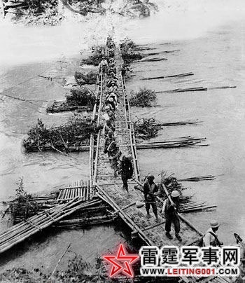 Bien Gioi 战役中一队越南人民军正通过Bac Can 省的一座竹制浮桥,这种浮桥在胡志明小道上非常典型。(1950)