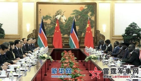 4月24日,中国国家主席胡锦涛在北京人民大会堂与来华访问的南苏丹共和国总统基尔举行会谈。