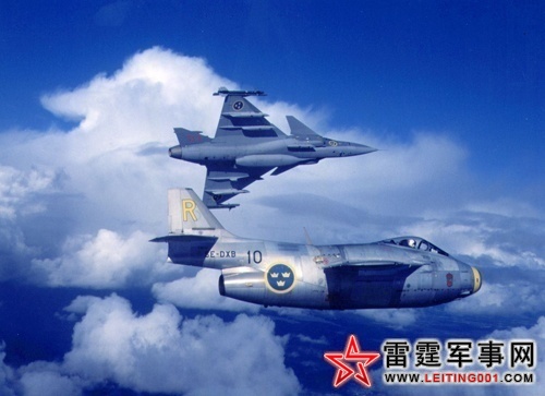 JAS-39与瑞典空军J29喷气战斗机一起飞行。